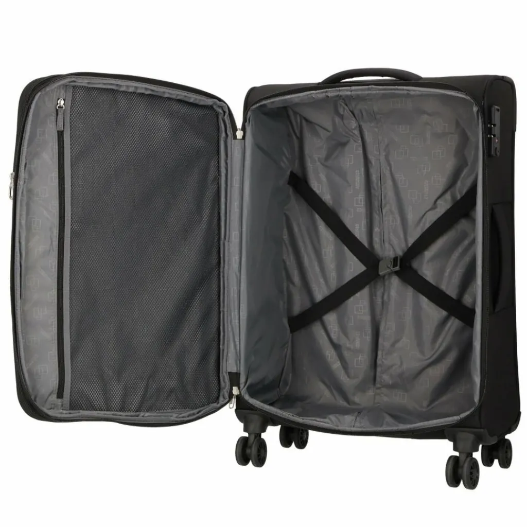 - Ausstattung: Tasche(n) außen, Netzfach, Kreuzpackgurt, Dehnfalte, arretierbarer Griff
