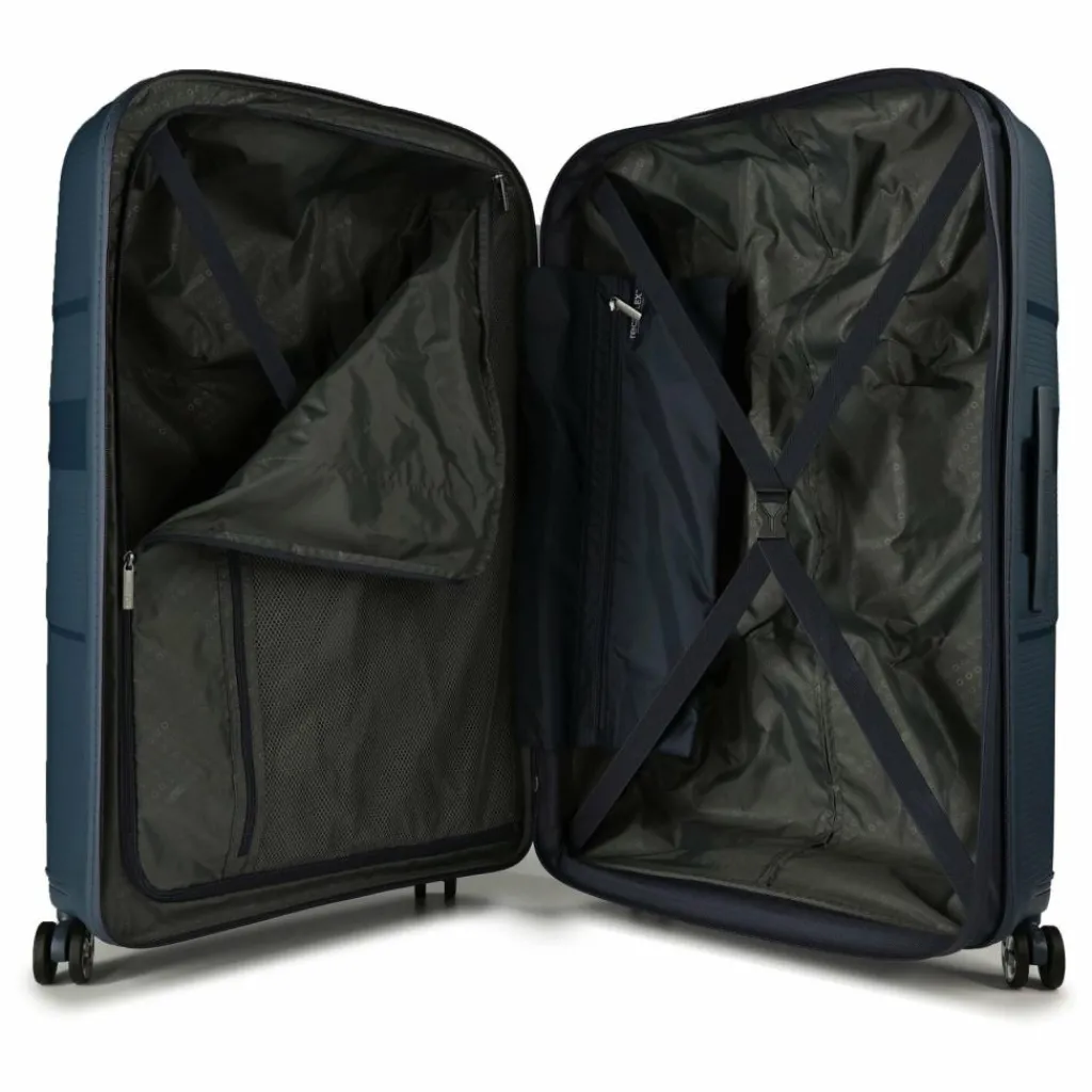 - Ausstattung: Wäschefach, Reißverschlussfach, Netzfach, Kreuzpackgurt, Dehnfalte, arretierbarer Griff