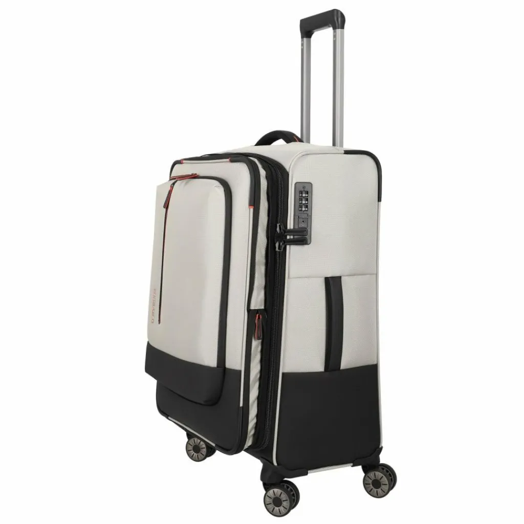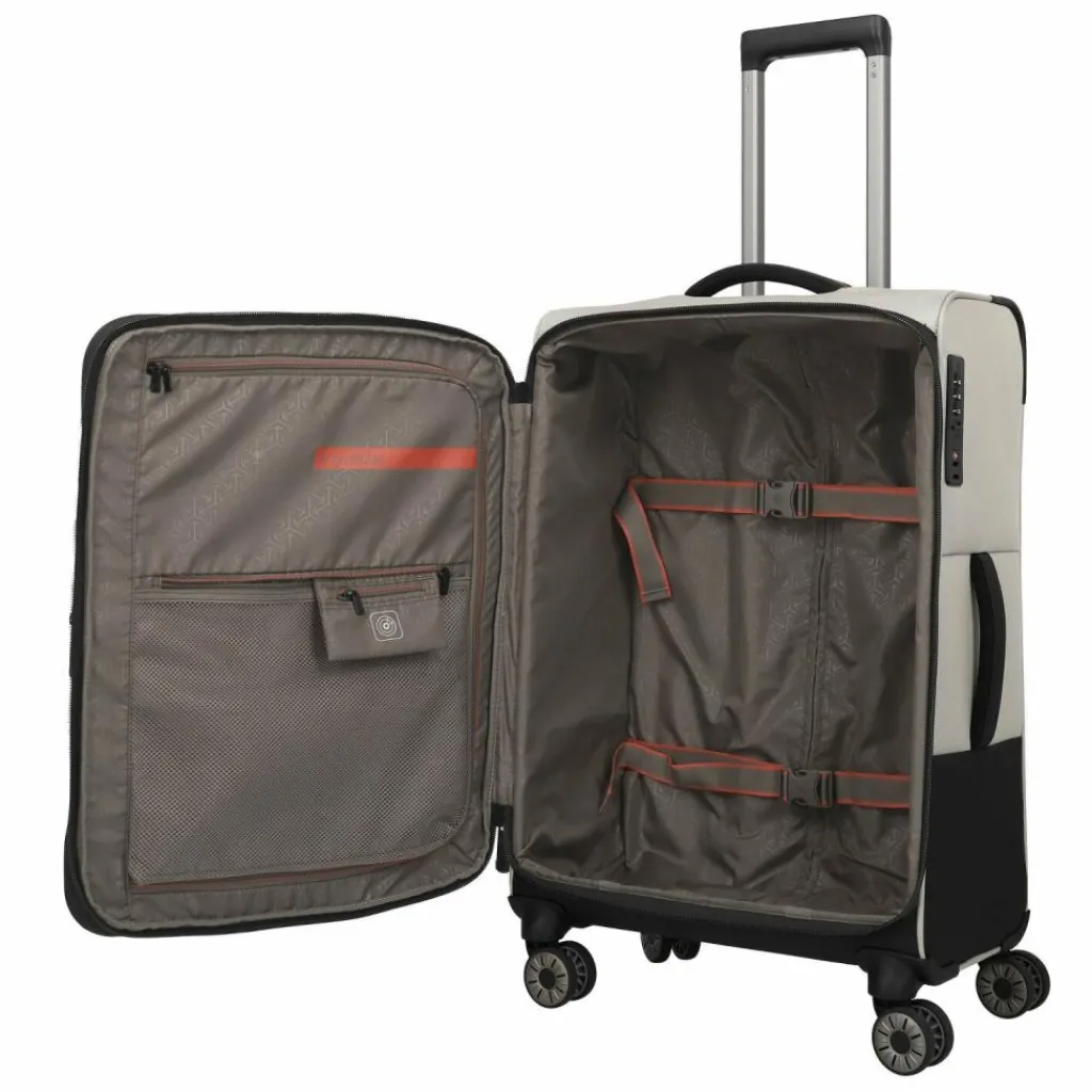 - Ausstattung:Tasche(n) innen, Tasche(n) außen, Reißverschlussfach, Netzfach, Kreuzpackgurt, Dehnfalte, arretierbarer Griff