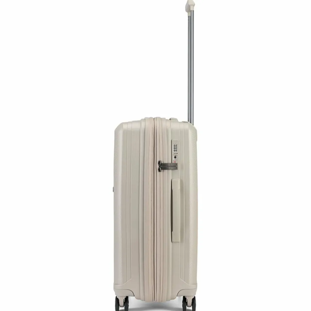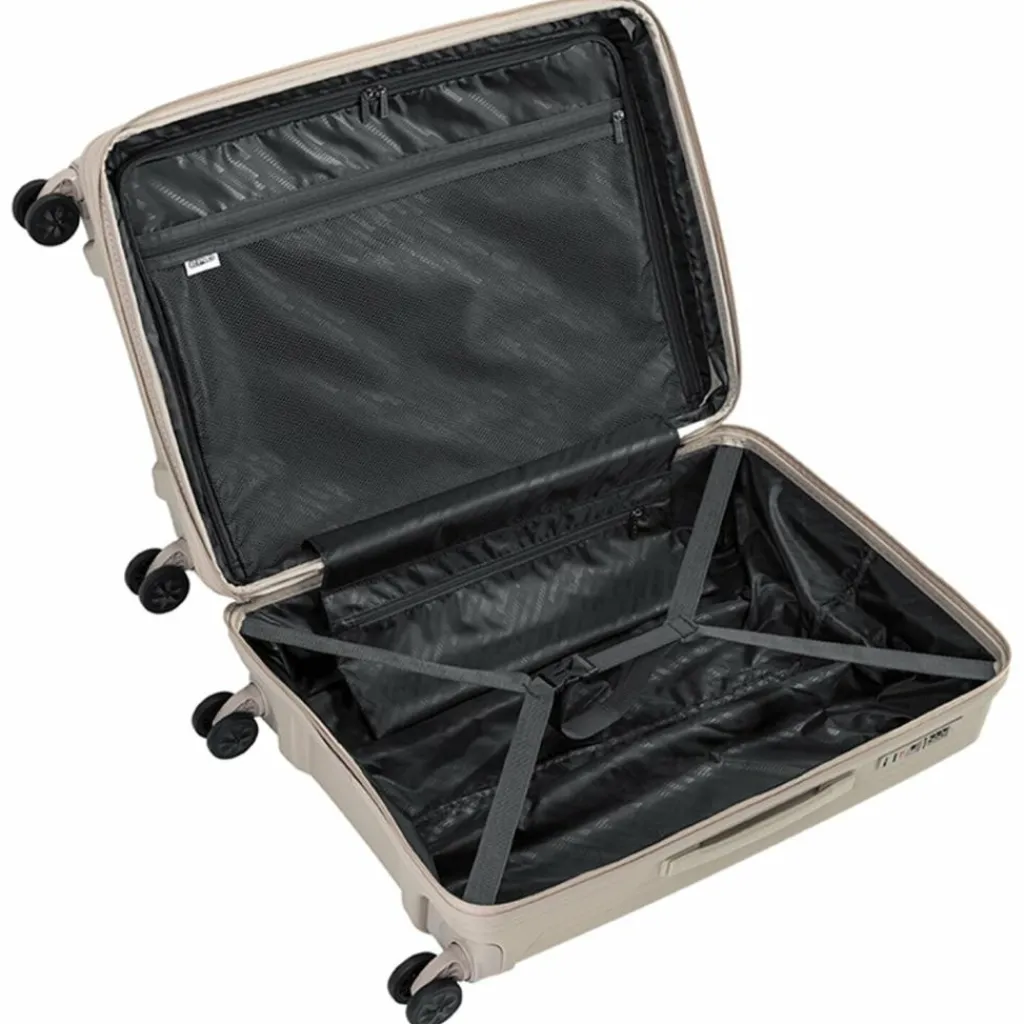 - Ausstattung: Wäschefach, Reißverschlussfach, Kreuzpackgurt, Dehnfalte, arretierbarer Griff