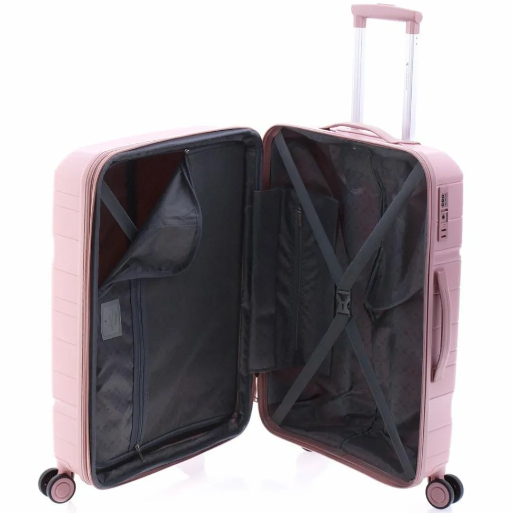- Ausstattung: Wäschefach, Reißverschlussfach, Kreuzpackgurt, Dehnfalte, arretierbarer Griff