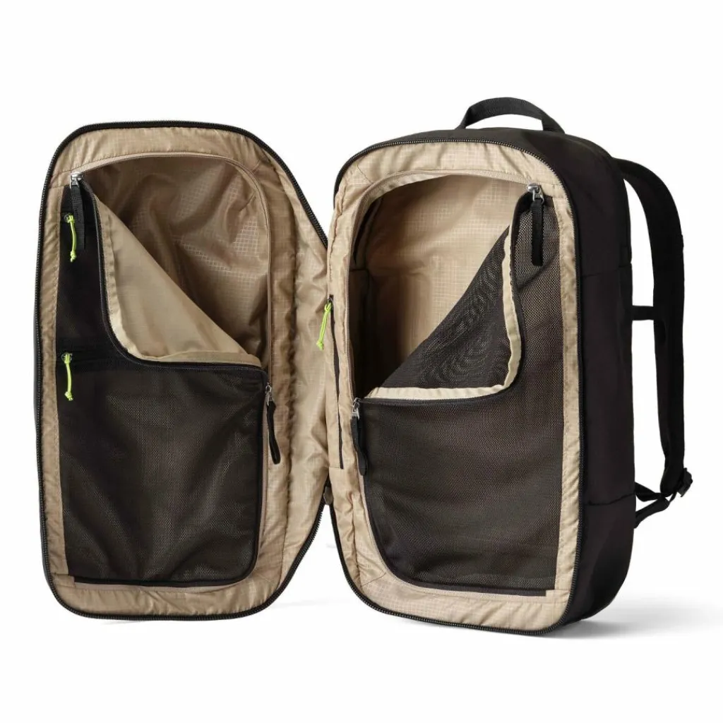 - Ausstattung: Wäschefach, Trinkflaschenfach, Tasche(n) außen, Reißverschlussfach, Netzfach, Brustgurt, auf Trolley steckbar