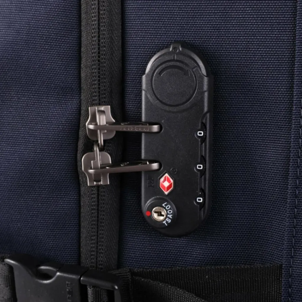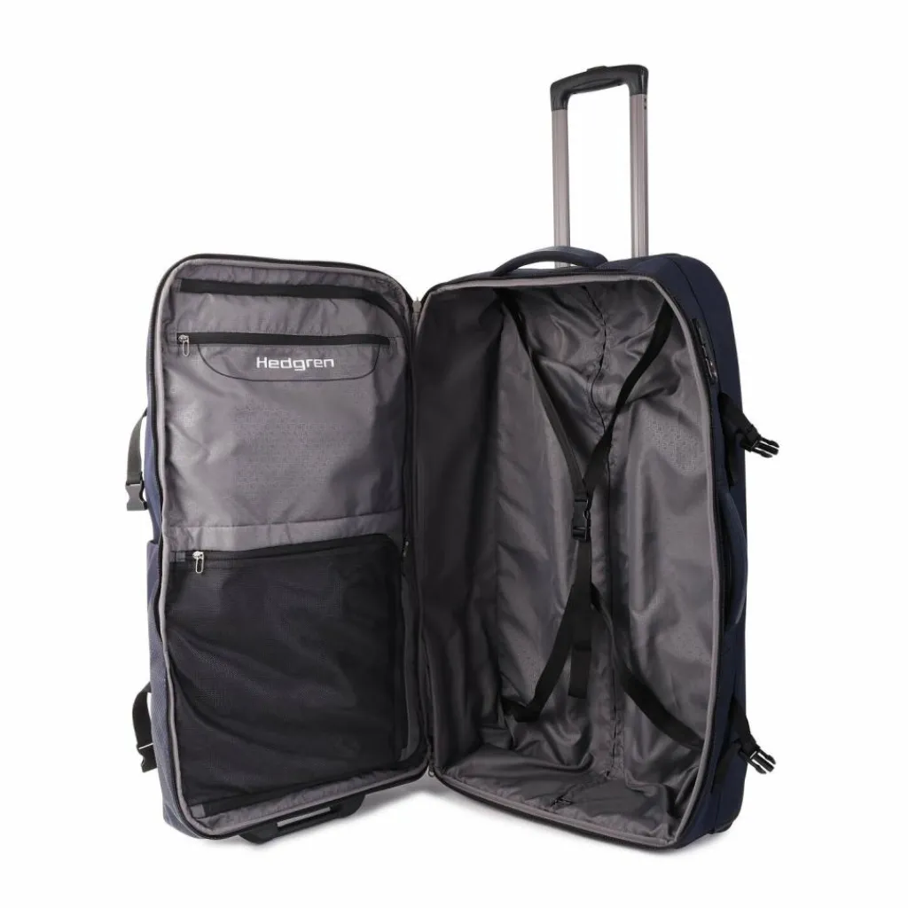 - Ausstattung: Tasche(n) innen, Tasche(n) außen, Reißverschlussfach, Netzfach, Kreuzpackgurt, arretierbarer Griff