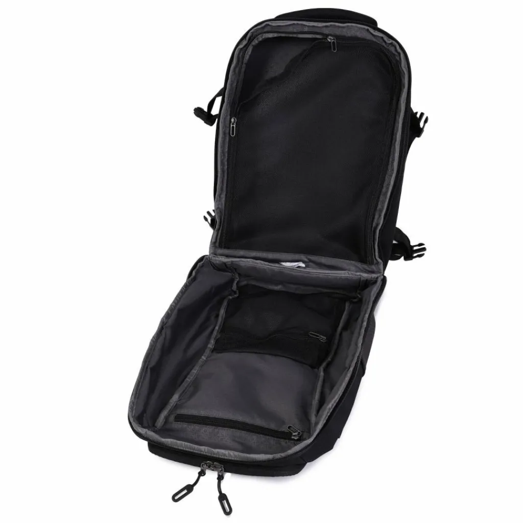 - Ausstattung: Wäschefach, Tasche(n) außen, Rückenpolsterung, Reißverschlussfach, Netzfach, auf Trolley steckbar