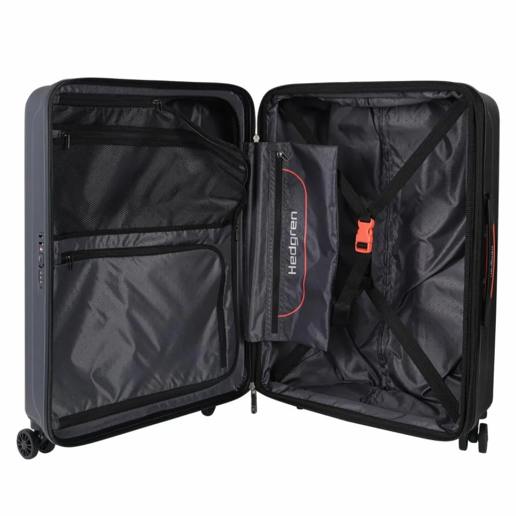 - Ausstattung: Tasche(n) innen, Reißverschlussfach, Netzfach, Dehnfalte, arretierbarer Griff