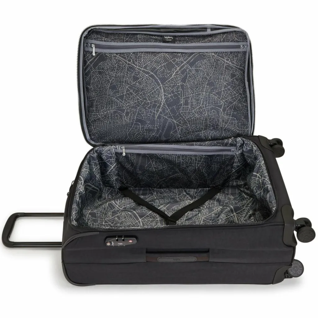 - Ausstattung: Tasche(n) innen, Tasche(n) außen, Reißverschlussfach, Netzfach, Dehnfalte, arretierbarer Griff