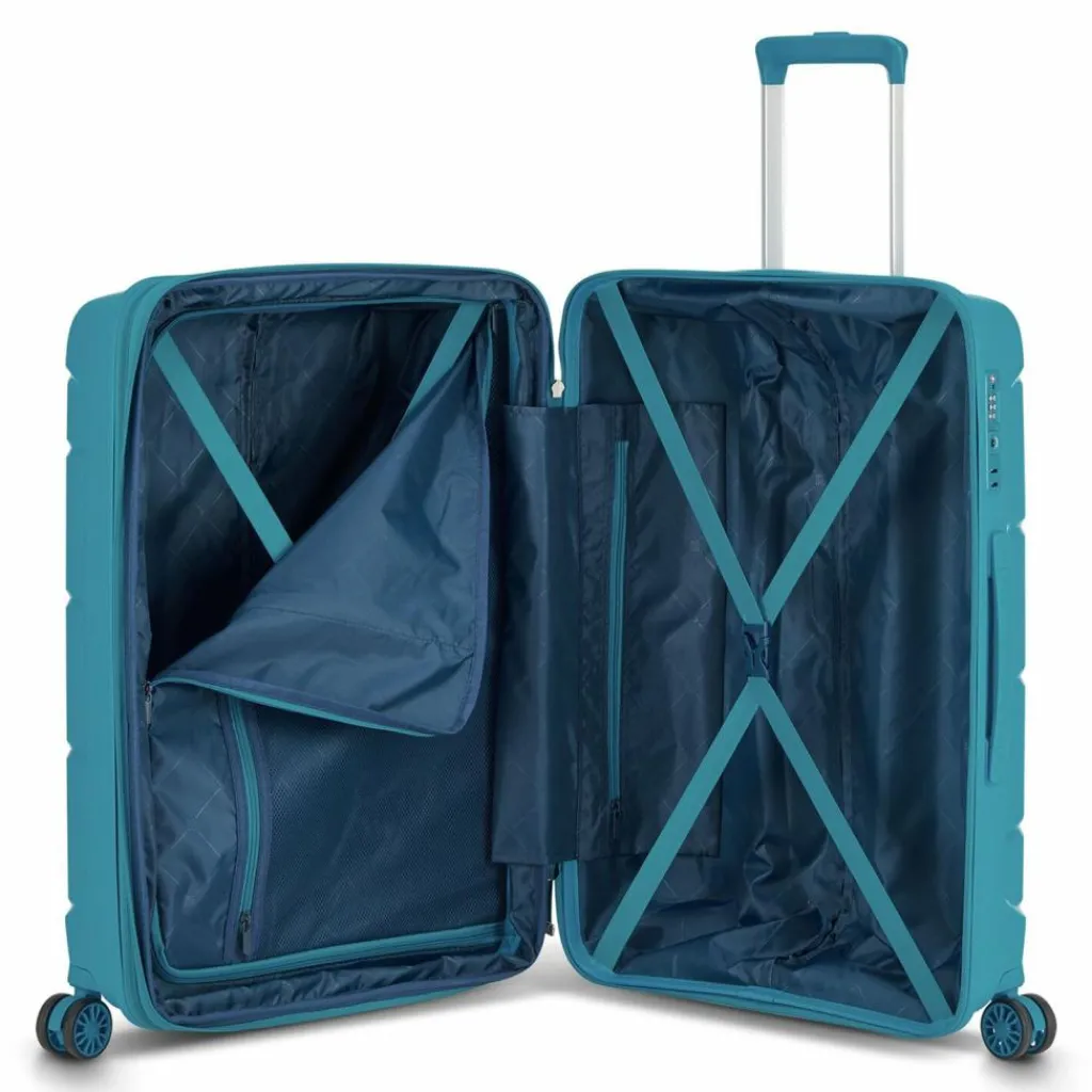 - Ausstattung: Wäschefach, Reißverschlussfach, Kreuzpackgurt, Dehnfalte, arretierbarer Griff