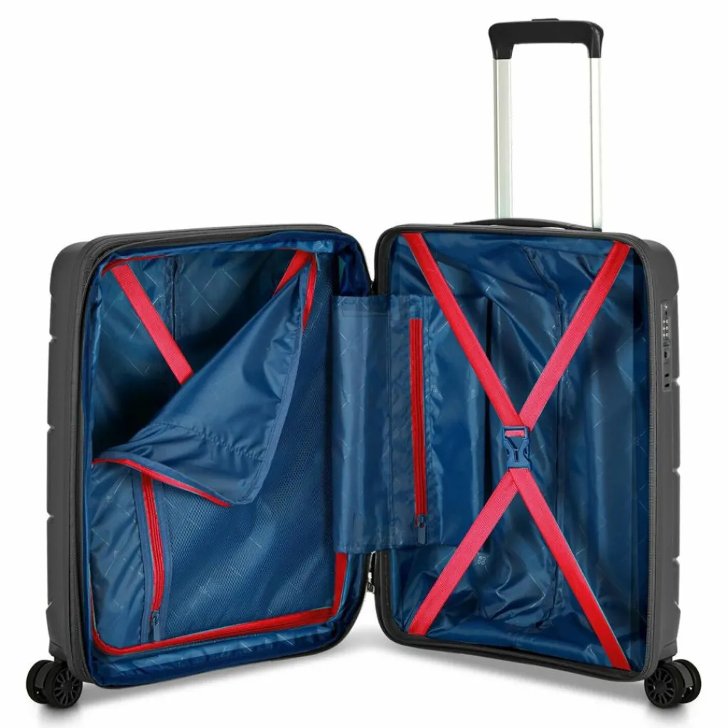 - Ausstattung: Wäschefach, Reißverschlussfach, Kreuzpackgurt, Dehnfalte, arretierbarer Griff