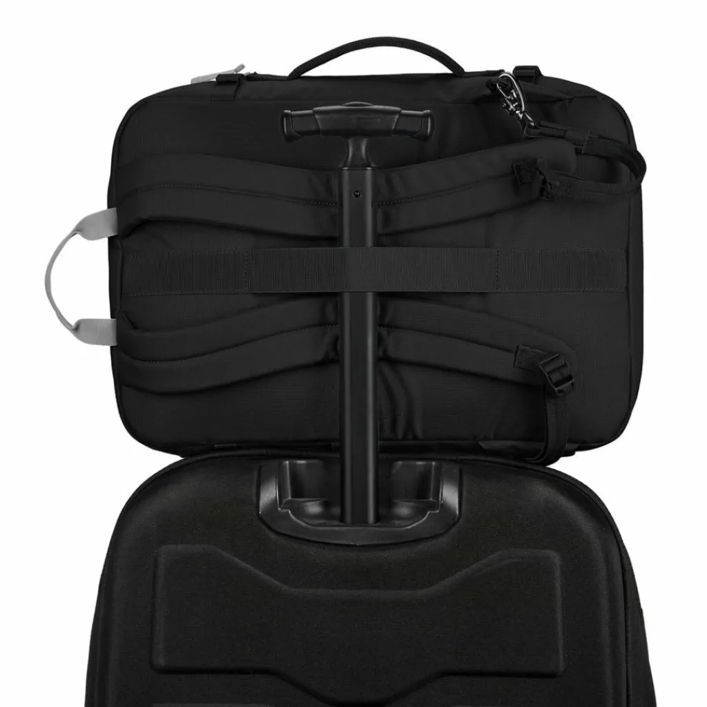 - Ausstattung: Tasche(n) innen, Tasche(n) außen, Reißverschlussfach, Handyfach, auf Trolley steckbar