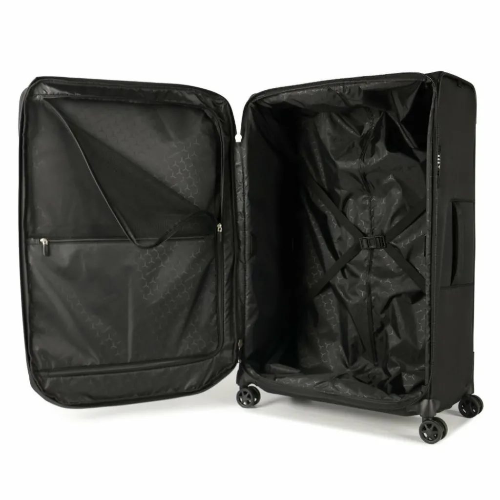 - Ausstattung: Tasche(n) innen, Tasche(n) außen, Reißverschlussfach, Netzfach, Kreuzpackgurt, Dehnfalte, arretierbarer Griff