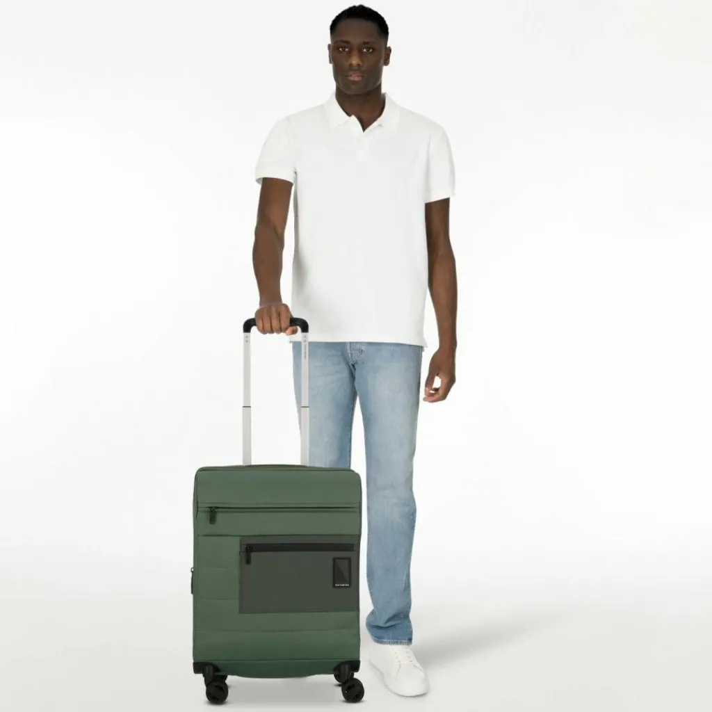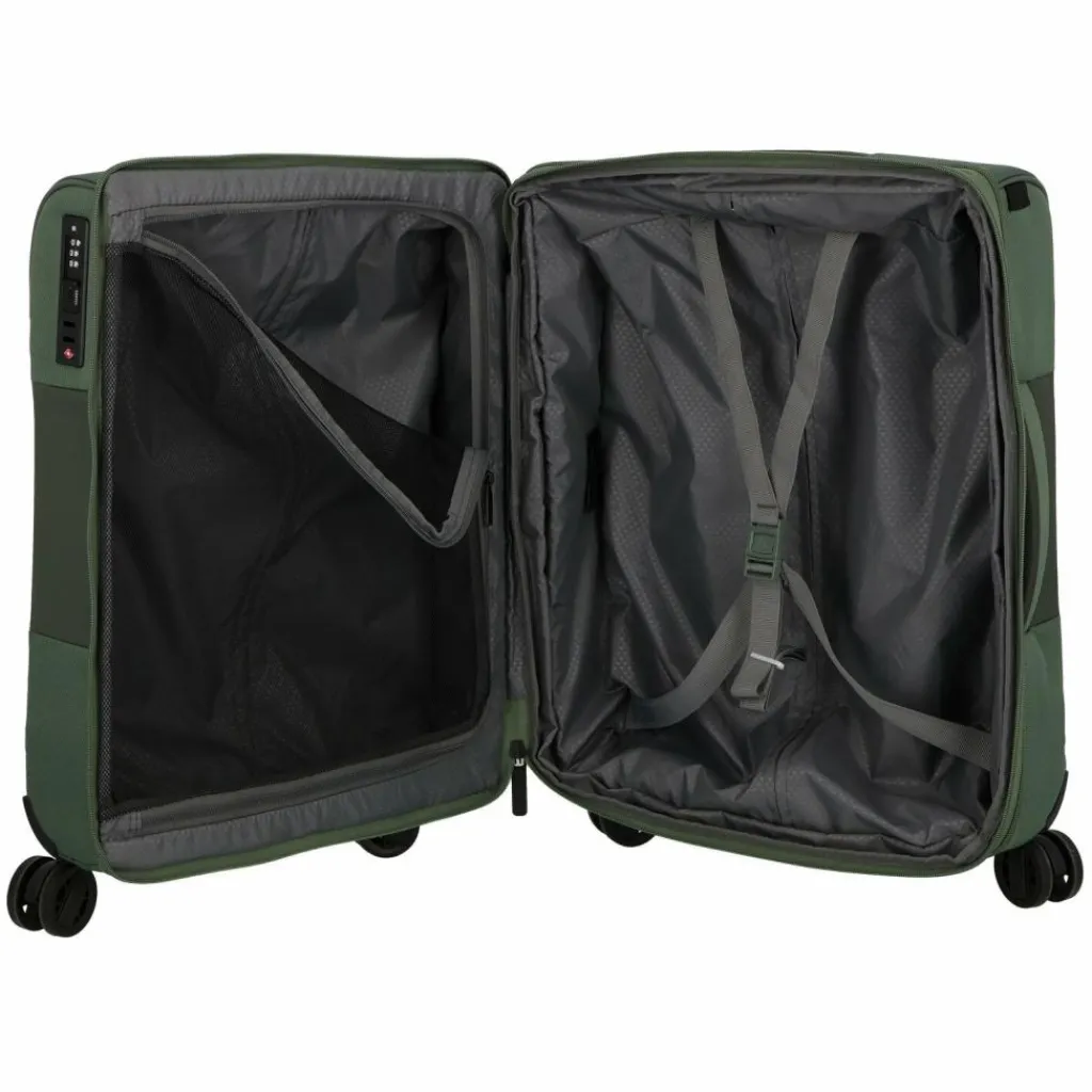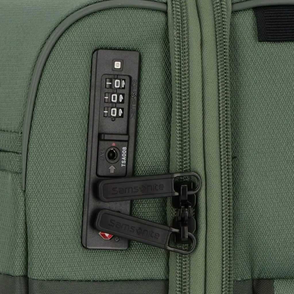 - Ausstattung: Tasche(n) innen, Tasche(n) außen, Reißverschlussfach, Netzfach, Kreuzpackgurt, Dehnfalte, arretierbarer Griff