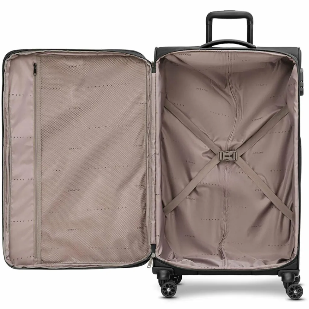- Ausstattung: Tasche(n) außen, Reißverschlussfach, Netzfach, Kreuzpackgurt, Dehnfalte, arretierbarer Griff
