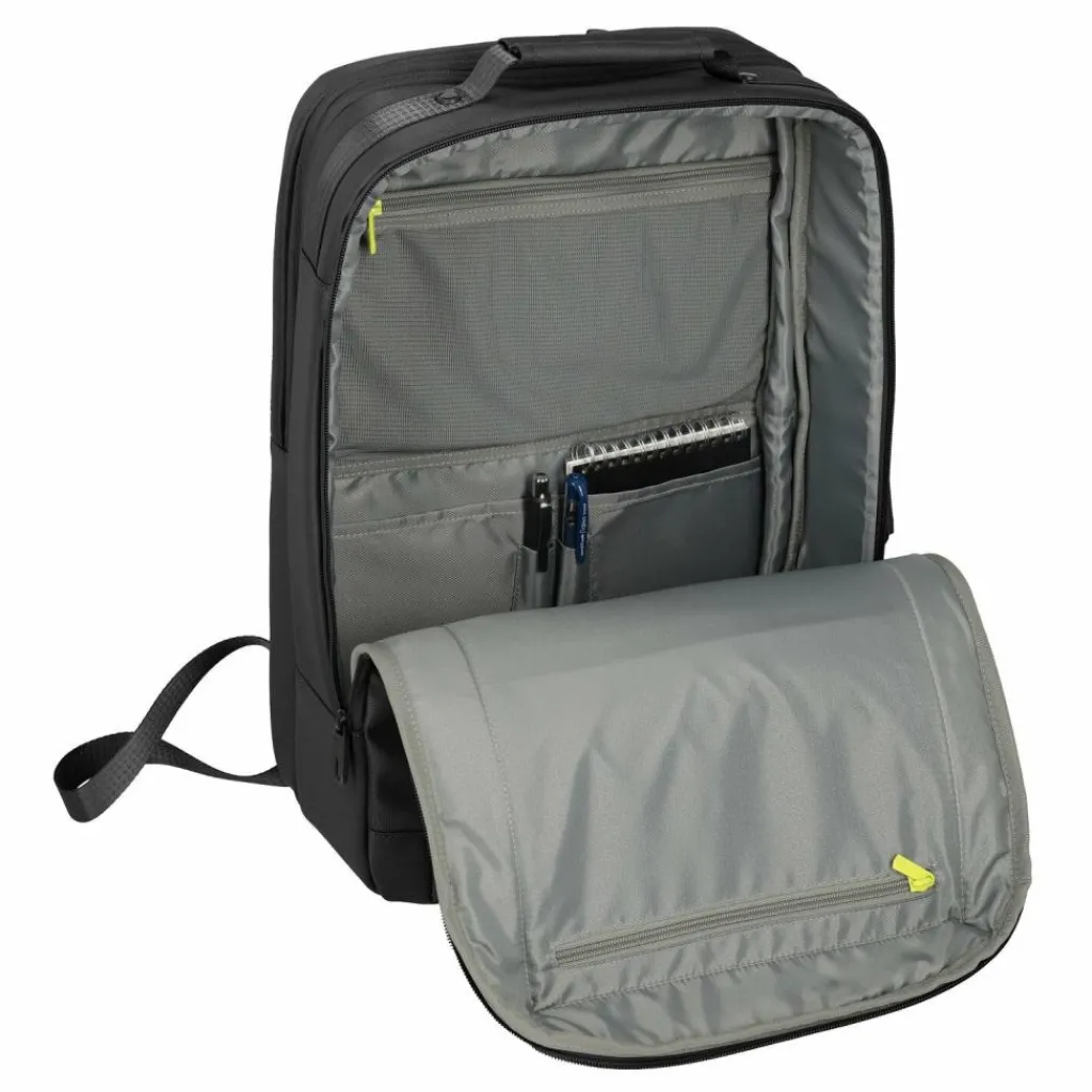 - Ausstattung: Tasche(n) innen, Tasche(n) außen, Rückenpolsterung, Reißverschlussfach, auf Trolley steckbar