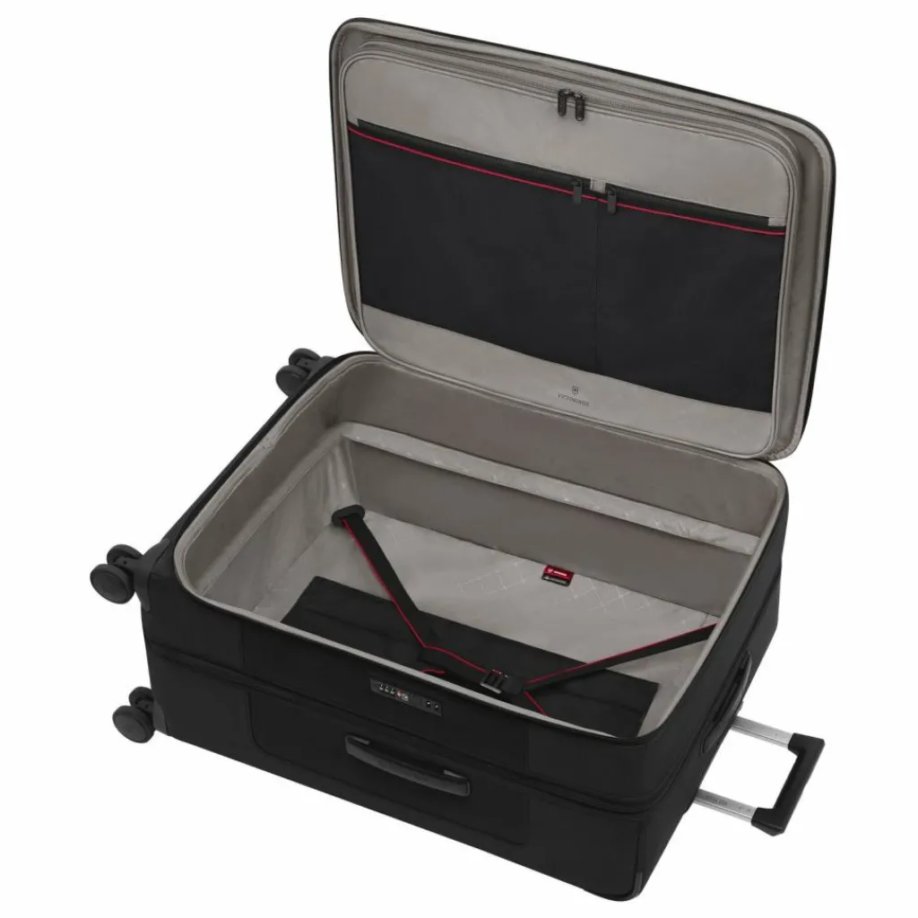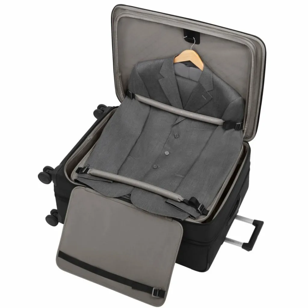 - Ausstattung: Tasche(n) innen, Tasche(n) außen, Reißverschlussfach, Kreuzpackgurt, Dehnfalte, arretierbarer Griff