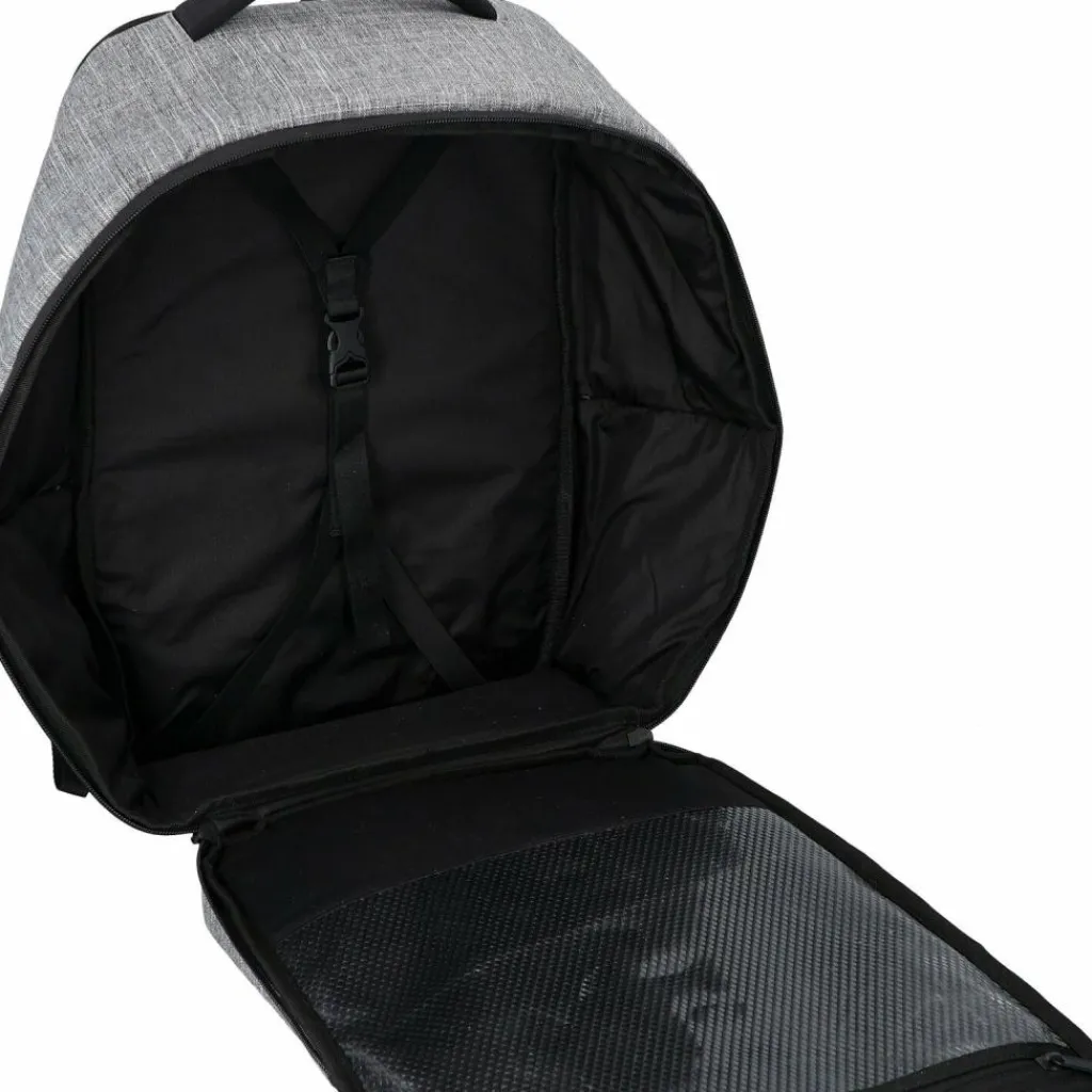 - Ausstattung: Trinkflaschenfach, Tasche(n) innen, Tasche(n) außen, Reißverschlussfach, Netzfach, Kreuzpackgurt, Handyfach, Brustgurt, auf Trolley steckbar