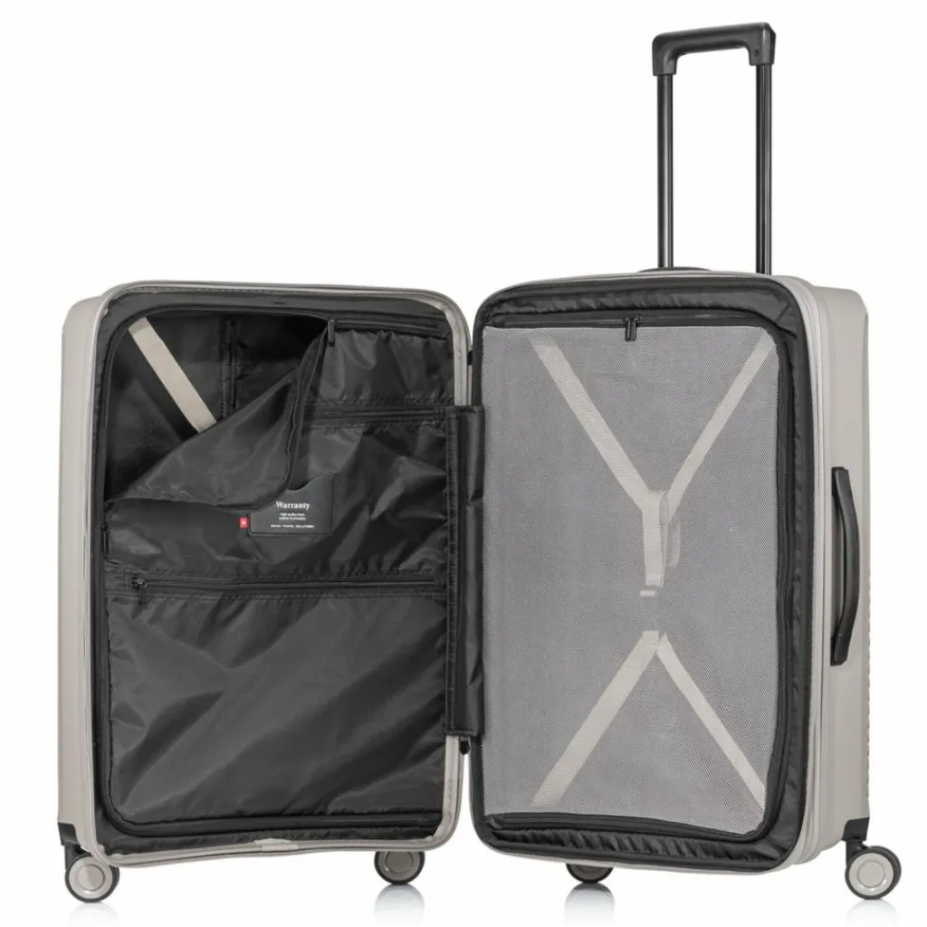 - Ausstattung: Wäschefach, Reißverschlussfach, Netzfach, Kreuzpackgurt, Dehnfalte, auf Trolley steckbar