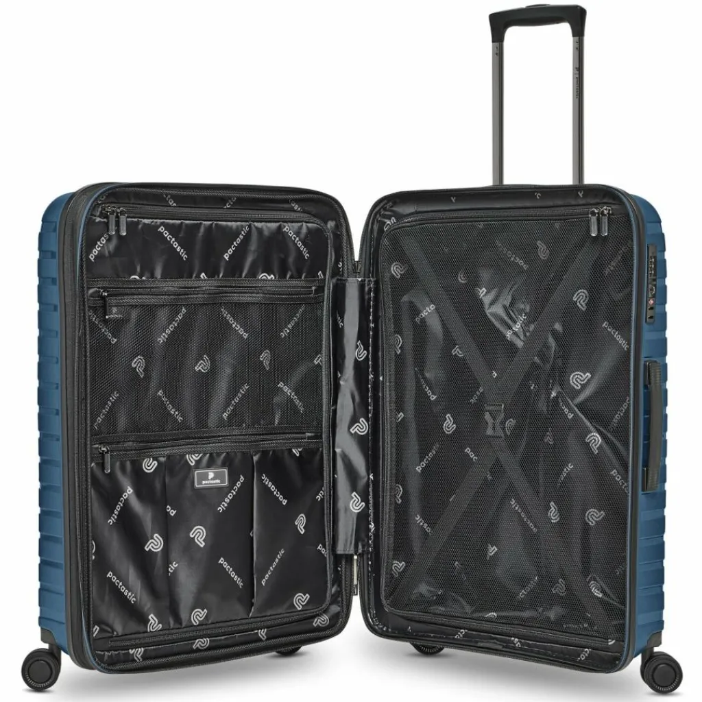 - Ausstattung: Wäschefach, Reißverschlussfach, Netzfach, Kreuzpackgurt, Dehnfalte, arretierbarer Griff