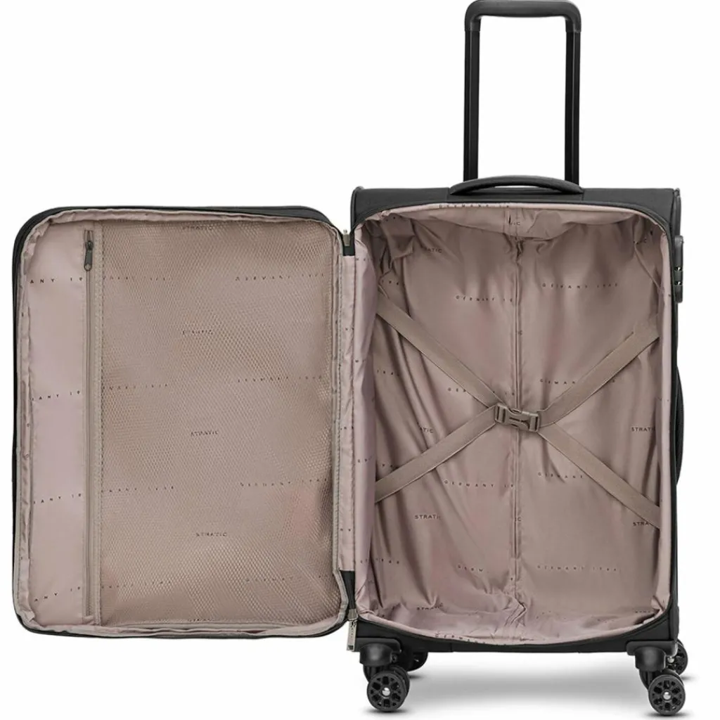 - Ausstattung: Tasche(n) außen, Reißverschlussfach, Netzfach, Kreuzpackgurt, Dehnfalte, arretierbarer Griff